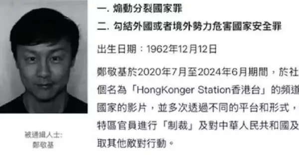 前TVB藝人鄭敬基涉「煽動分裂國家」被懸紅100萬通緝,已潛逃國外