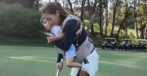 何雁詩帶娃打高爾夫!背2歲罕見病兒子在胸前揮桿,盡展堅韌母愛