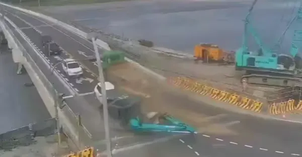 拖板車轉彎怪手重摔!13噸鋼鐵猛獸墜地 嚇壞後車急煞