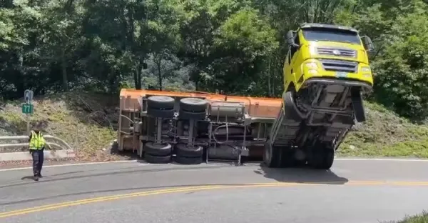 砂石車下坡過彎失控 車斗翻覆車頭「翹孤輪」 網笑「一柱擎天」