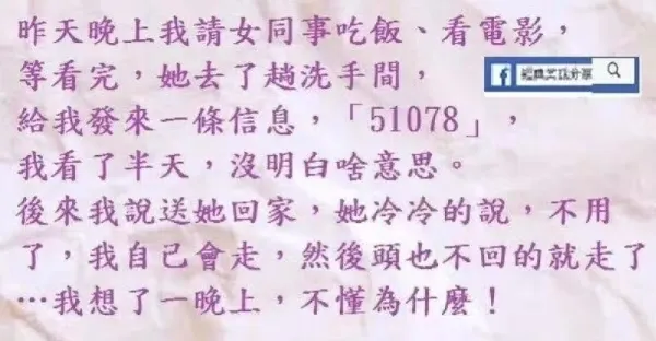 晚上我請女同事吃飯,她去了趟洗手間,給我發來一條信息,「51078」,我看了半天,沒明白啥意思!