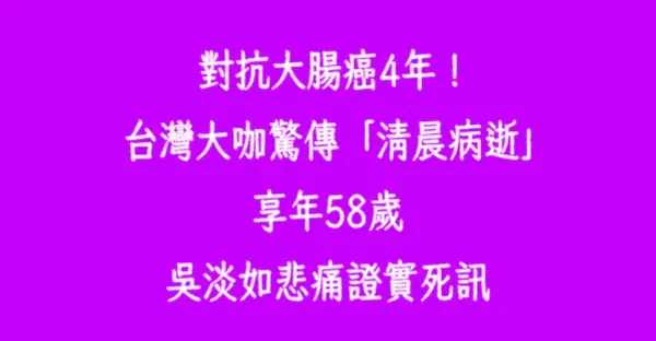 對抗大腸癌4年!台灣大咖「清晨病逝」享年58歲 吳淡如悲痛證實死訊!