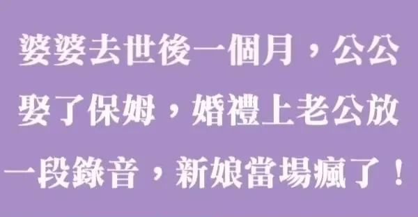 婆婆去世後一個月,公公娶了保姆,婚禮上老公放一段錄音,新娘當場氣瘋了