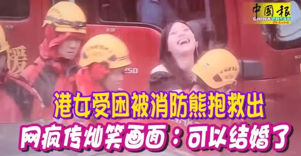 港女受困被消防熊抱救出 網瘋傳燦笑畫面:可以結婚了