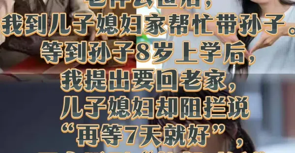 老伴去世後,我到兒子媳婦家幫忙帶孫子。等到孫子8歲上學後,我提出要回老家,兒子媳婦卻阻攔說「再等7天就好」,無意聽到「他們對話」 我愣了 ....