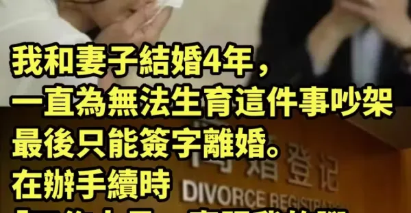 我和妻子結婚4年,一直為無法生育這件事吵架,最後只能簽字離婚。在辦手續時「工作人員一直踢我的腳」,我「轉頭看到妻子」:不離了