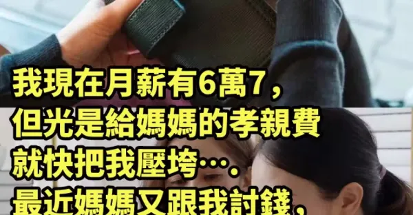 我現在月薪有6萬7,但光是給媽媽的孝親費就快把我壓垮….最近媽媽又跟我討錢,我給不出來「她竟冷冷嗆我」讓我徹底心寒,不給錢真的就是不孝順嗎?