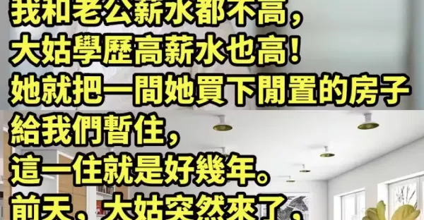 我和老公薪水都不高,大姑學歷高薪水也高!她就把一間她買下閒置的房子給我們暫住,這一住就是好幾年。前天,大姑突然來了,老公請我去買菜,到家時「隔著門聽到他們的對話」我瞬間就哭了