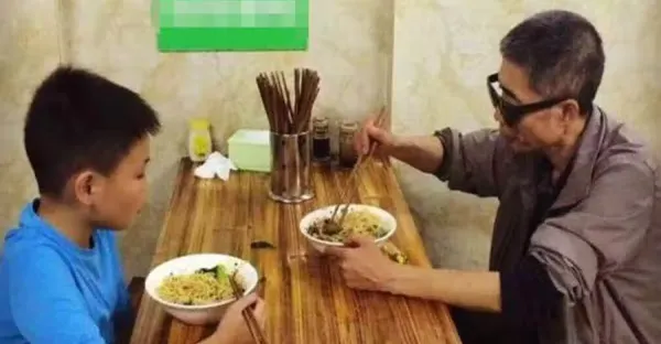 小男孩帶失明父進麵館,點餐大喊「大喊2碗、卻偷偷比1」老闆秒懂,父子離開後,留下的東西讓老闆淚目😢