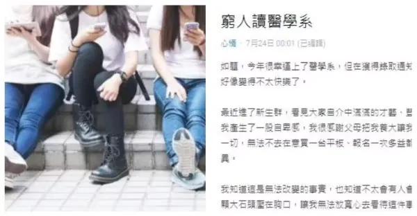 「考上醫學系,但我不快樂!」進了新生群組後,越來越自卑...同學們都好有錢、會很多才藝、常出國旅遊,我很感謝父母養大我,但我真的無法停止比較,這就是階級複製的悲哀嗎... #詳情見留言