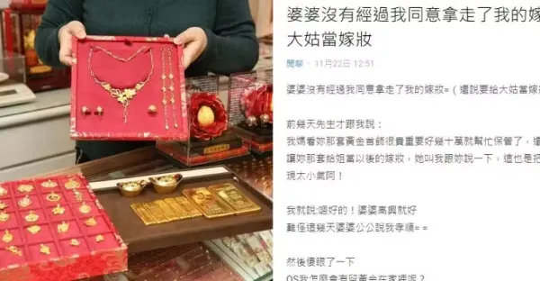 婆婆隨意拿走金飾,要老公轉告「給大姑當嫁妝,別計較太多」她一聽愣住「房間沒有黃金啊」