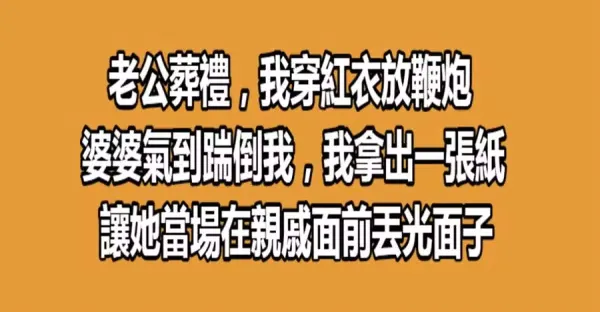 老公葬禮,我穿紅衣放鞭炮,婆婆氣到踹倒我,我拿出一張紙,讓她當場在親戚面前丟光面子!