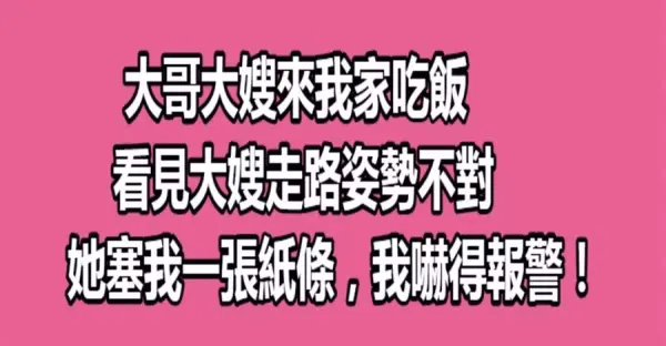 大哥大嫂來我家吃飯,看見大嫂走路姿勢不對,她塞我一張紙條,我嚇得報警!