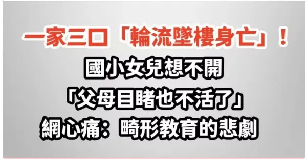 一家三口「輪流墜樓身亡」!國小女兒想不開「父母目睹也不活了」 網心痛:畸形教育的悲劇