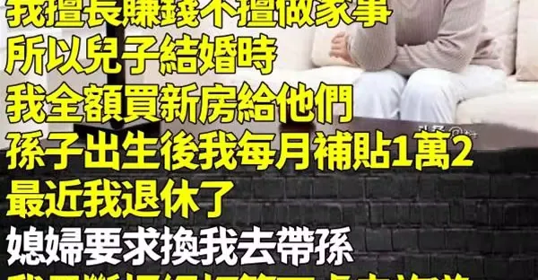 我擅長賺錢不擅做家事!所以兒子結婚時我全額買新房給他們、孫子出生後我則是每月補貼1萬2。最近我退休了「媳婦要求換我去帶孫」我果斷拒絕,打算四處去旅遊,她卻說:「那您別後悔,我以後不能幫您養老....」 #接著我也出招了
