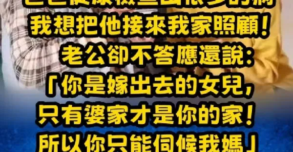 爸爸健康檢查出很多的病…我想把他接來我家照顧!老公卻不答應還說:「你是嫁出去的女兒,只有婆家才是你的家!所以你只能伺候我媽」隔天「我對婆婆做一件事」讓老公閉嘴:這樣夠公平了吧~