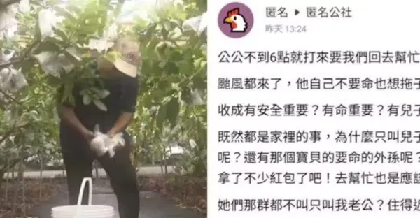 放颱風假一早,不到6點公公就打來,要我和老公回去「幫忙搶收水果」!他不要命拖子女下水?收成有安全重要?而且還有大姑小姑、女婿外孫,她們那群都不叫,只叫我老公 # 被網友吐槽