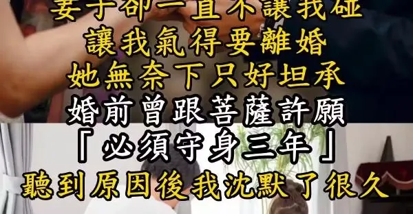 結婚剛滿半個月,妻子卻一直不讓我碰,讓我氣得要失婚!她無奈下只好坦承,婚前曾跟菩薩許願「必須守身三年」,聽到原因後我沈默了很久...
