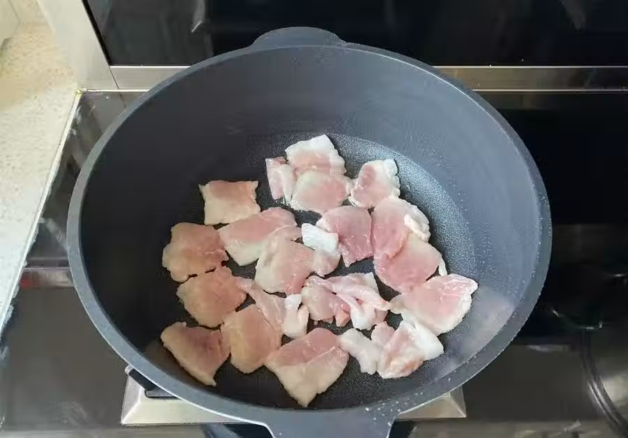 3、不粘鍋無需放油,直接放入五花肉,小火慢煎。