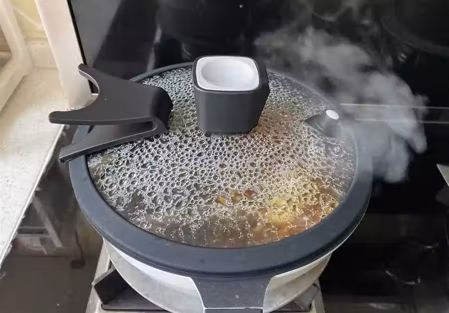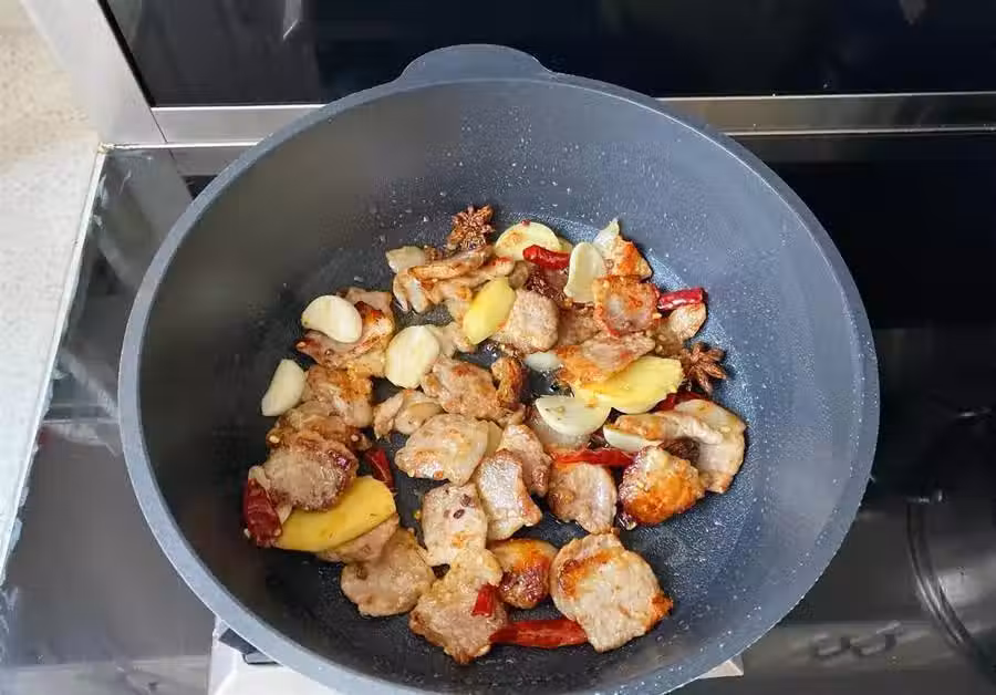 7、再倒入1碗水,蓋上蓋子,中小火加熱燜至水分略幹出油即可。