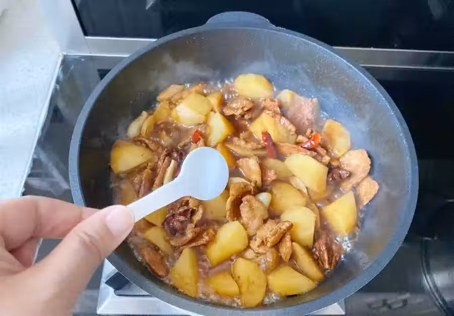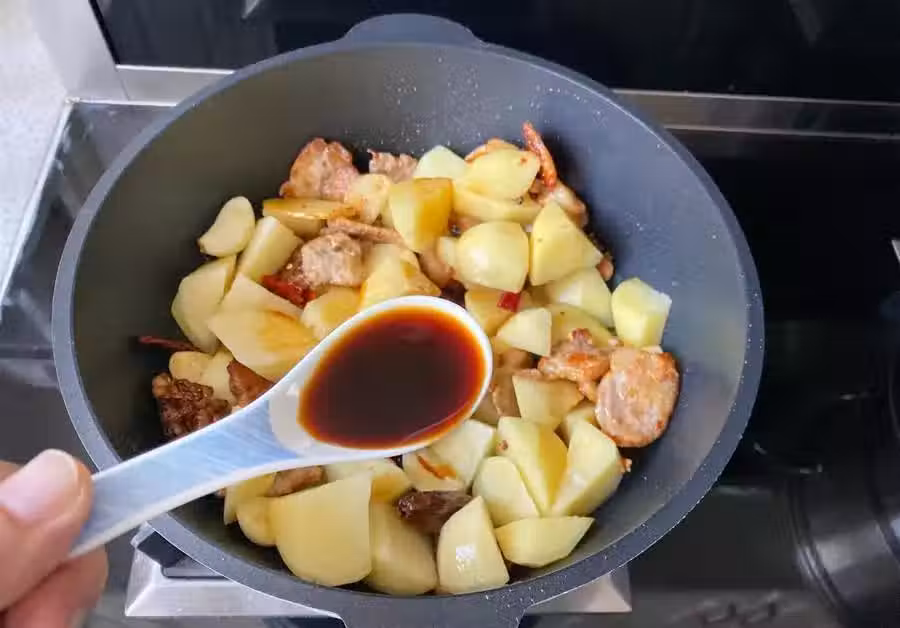 6、倒入土豆塊,加入2勺生抽,1勺老抽,1小勺冰糖,略微拌勻。