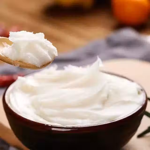 3.酵母粉發酵五分鐘後,在裡面加入一勺的豬油。這樣揉出來的麵團就會更加光滑一些啦!蒸出來的包子或者饅頭喧軟又好吃啦。