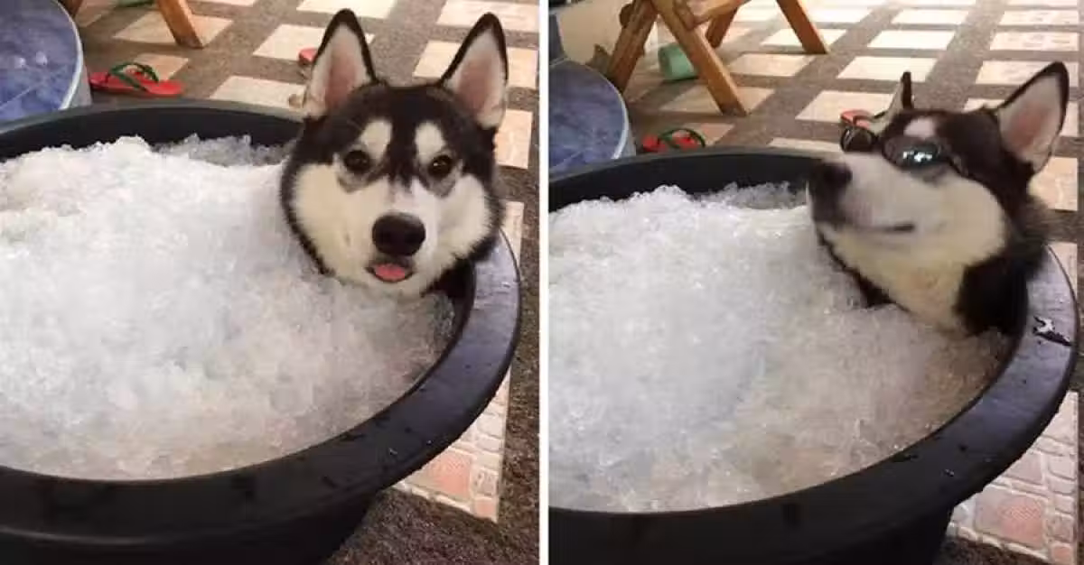 為了給哈士奇「降溫」,主人為牠準備了「一大缸冰塊」,狗狗:彷彿回到了老家