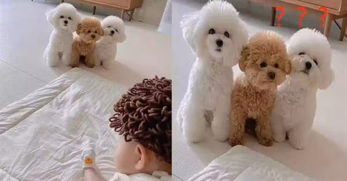 三隻狗狗見到「剛出生的小主人」,牠們反應笑爆全網:「這是個什麼生物?」