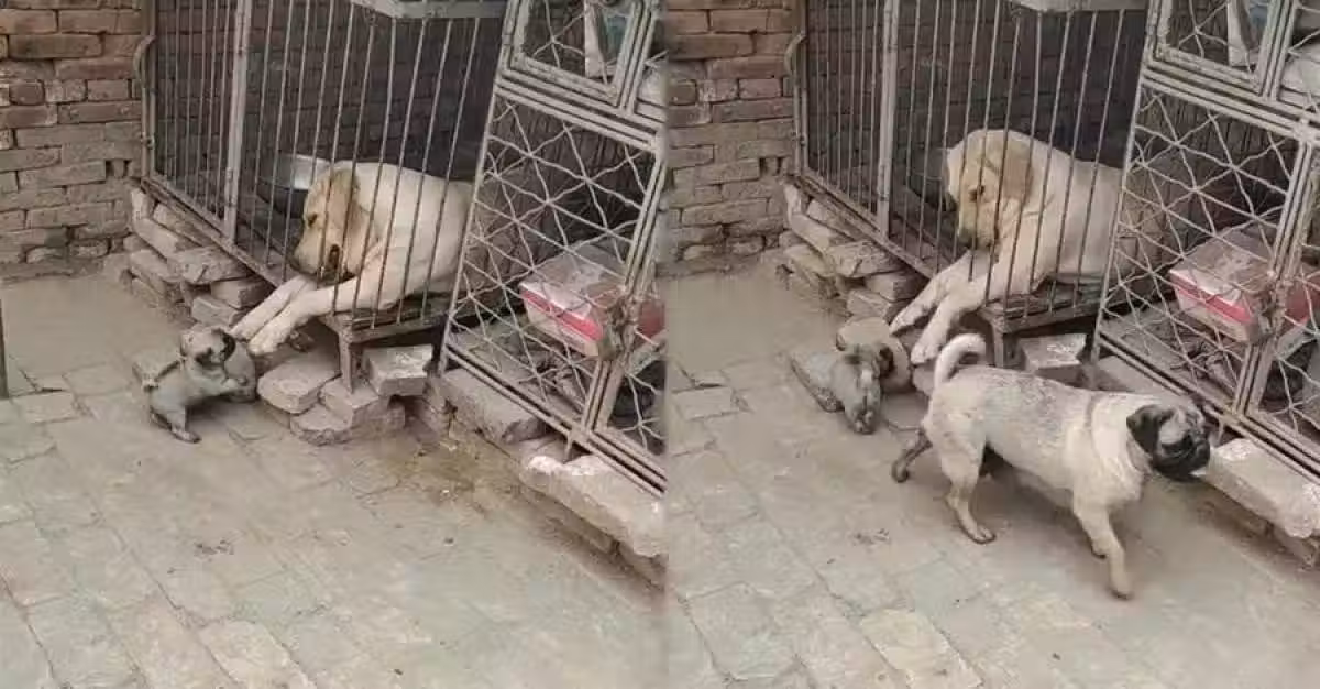 「失去孩子」的狗媽在籠中,陌生小狗跑來安慰,狗媽伸手撫摸小狗的臉