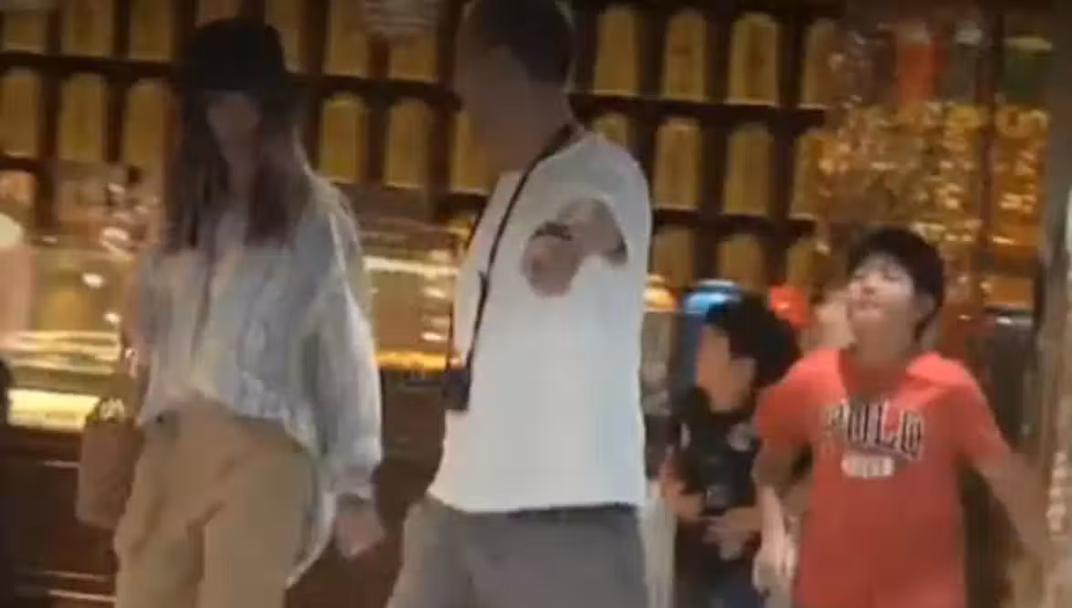 丈夫身穿粉色t恤,為小兒子拍照。他抱著這位著名女子的女兒,看起來像極了他的哥哥李!