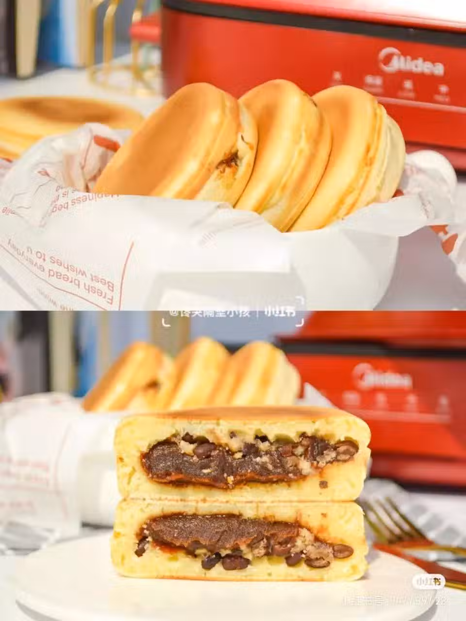 5.再舀一勺麵糊,放上蜜豆,把之前的半個蓋在上面,壓一壓粘合,做好的車輪餅可輕鬆取出