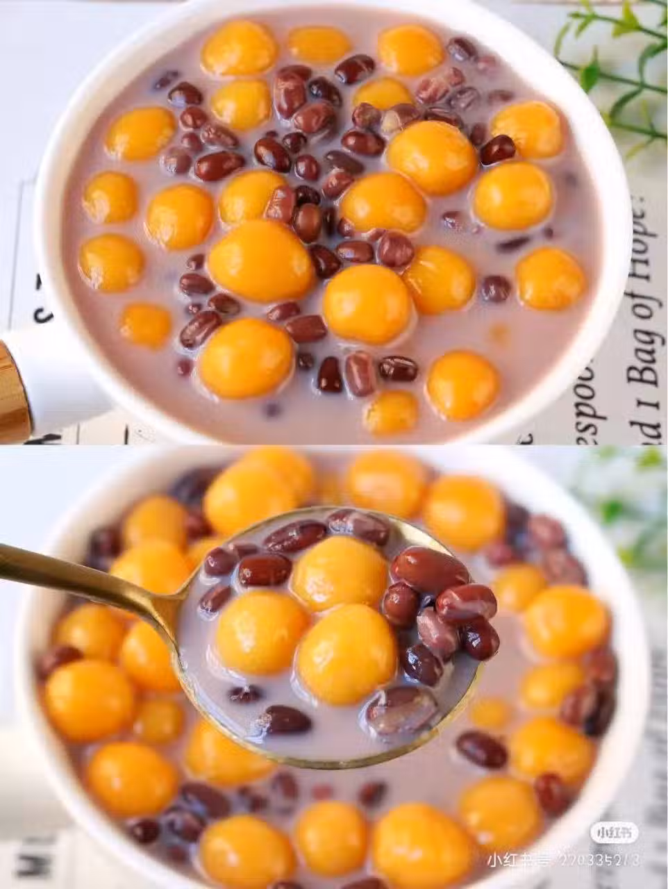 3.紅豆湯加入兩勺白糖煮融化,加入南瓜丸子煮一會兒即可,關火加入牛奶拌勻就完成啦