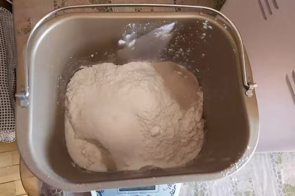 3.然後把麵粉、糖、酵母、鹽也放入桶內。(鹽、糖、酵母要防止不同的角落喲)