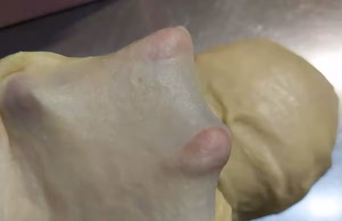5.一直揉到麵團達到能拉出很薄的薄膜的完全階段。