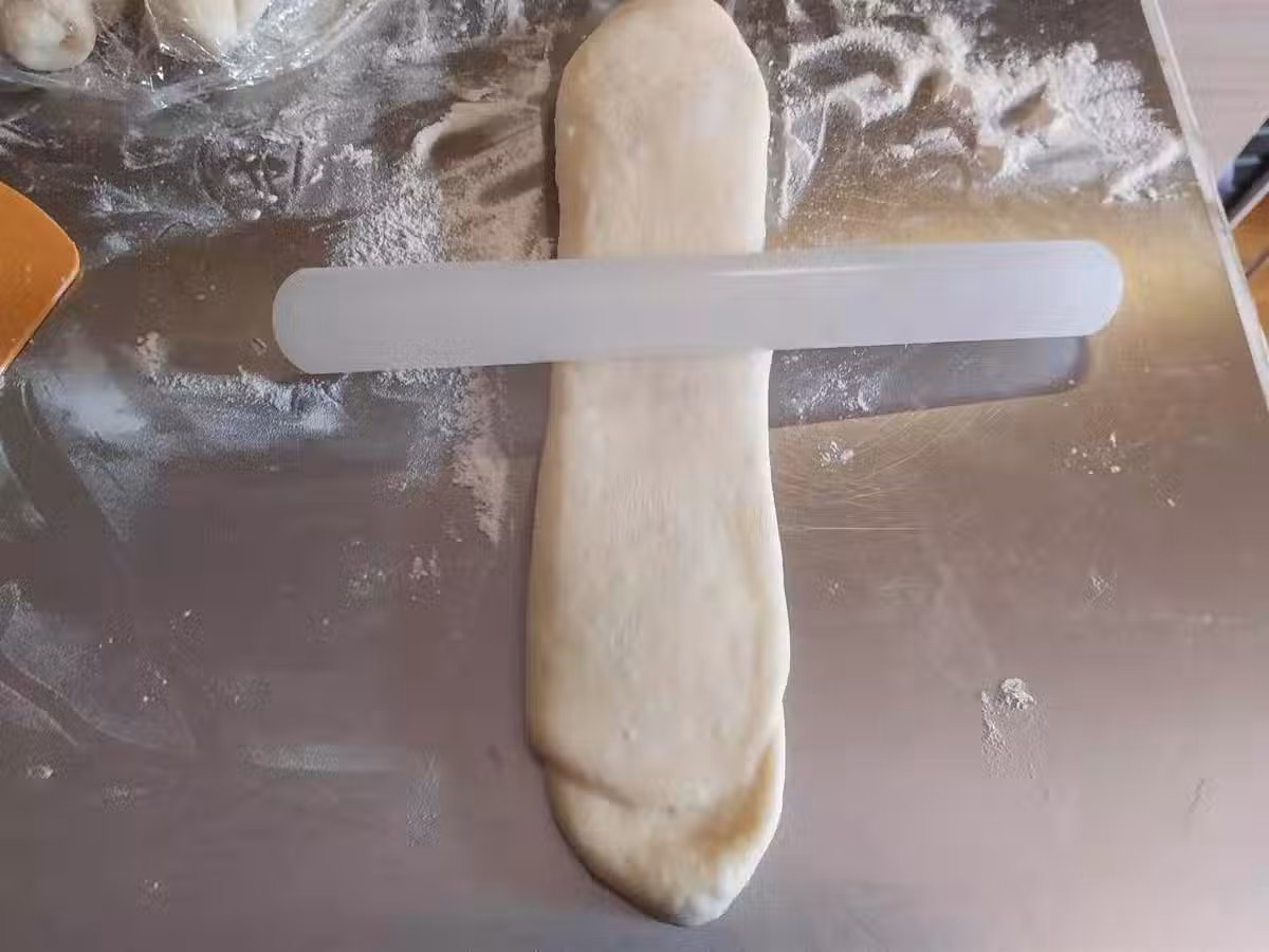 12.再取一個擀卷的麵團,再次擀成長舌狀,不要來回擀,在中間固定,然後用擀麵杖朝兩邊拉長,長度要比之前長一些。