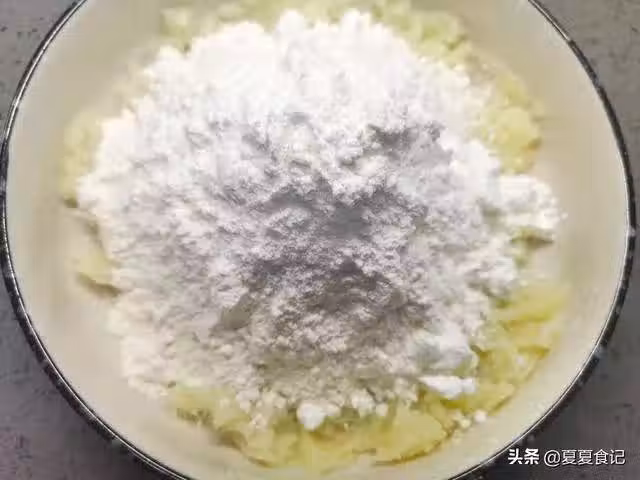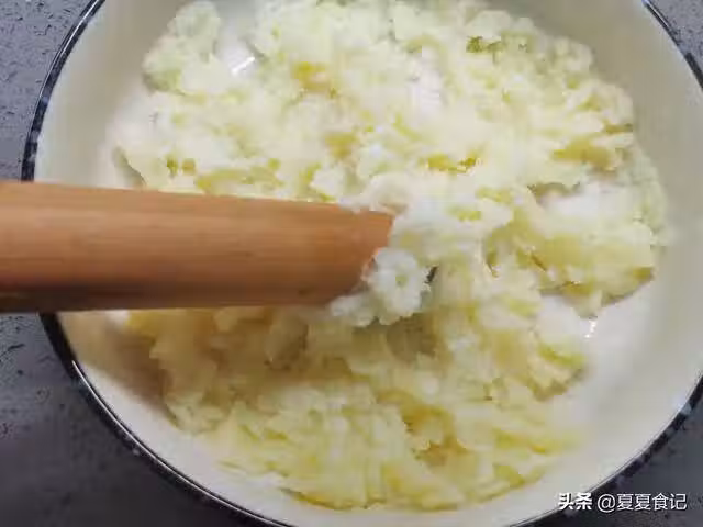 1、 土豆清洗乾淨,去掉外皮,切成薄片,上鍋蒸熟,用擀麵杖壓成泥。倒入100g澱粉,50g麵粉,用筷子攪拌均勻,然後揉成光滑的麵糰。請注意,這個土豆加澱粉不太好揉,因為土豆蒸熟後有水分,不需要加水,多揉一會兒就可以揉圓了。