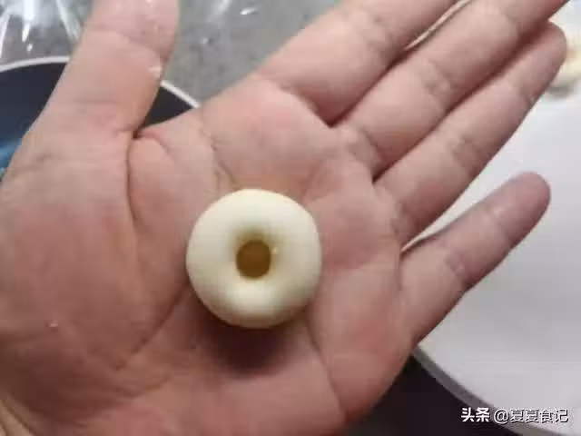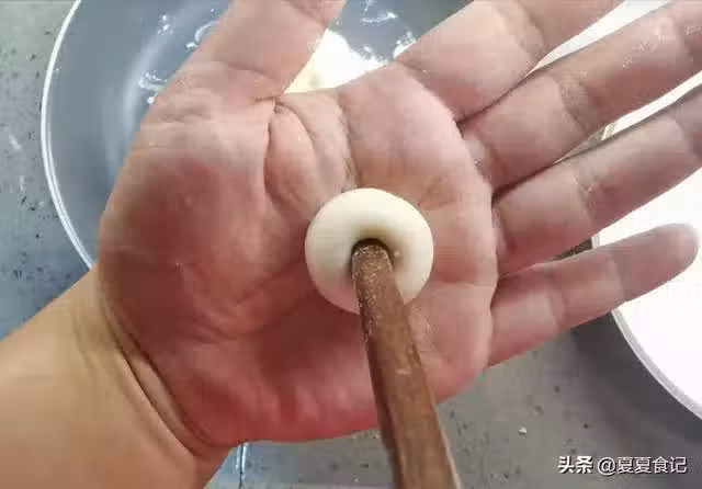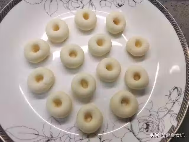 2、 掐一小坨麵糰,揉圓,然後拿一隻筷子,用筷子的尾端插進小麵糰里,因為麵糰有些粘,輕輕的轉動一下筷子,就把筷子取出來了,這樣就形成一個扣子的形狀,非常的可愛。全部做好後,擺放在盤子裡。