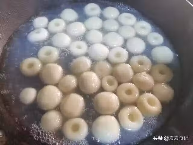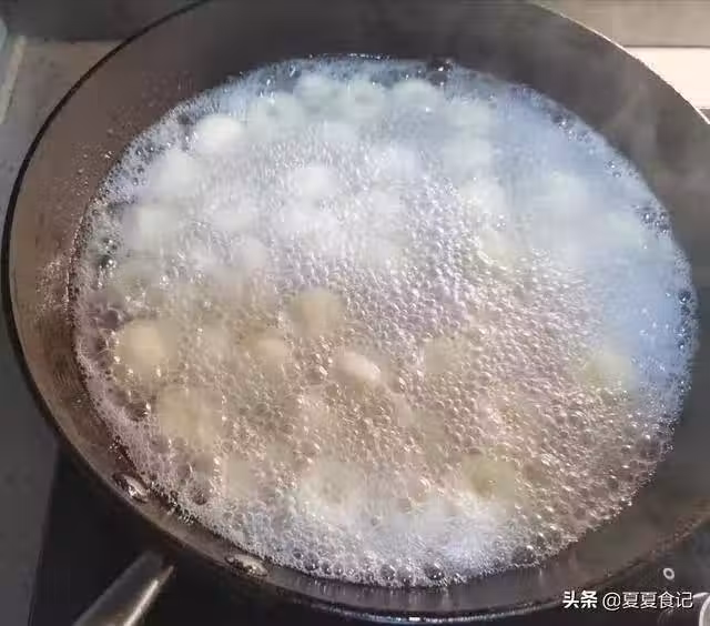 3、 鍋中水燒開,淋入適量的食用油,防止煮的時候粘連,然後再把土豆窩窩放進去煮,大概煮2-3分鐘左右,就漂起來了,全部漂起說明煮好了,就可以撈出來。撈出後,趕緊往土豆窩窩上淋上一層油,攪拌一下,這樣做的目的是不會粘連。