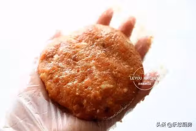 第七步:取另外一半的肉餡,團成一個小餅狀,如圖。