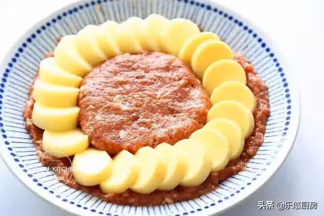 第六步:把玉子豆腐擺在肉餡上,如圖,圍一圈,放在肉餡邊上。