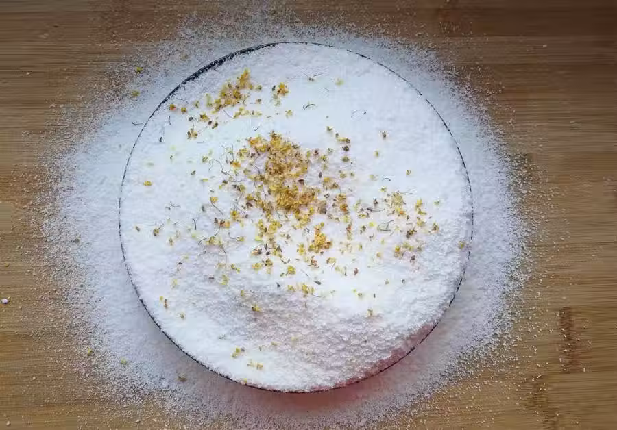 5、加入幹桂花輕輕拌勻。也可以換成玫瑰花瓣等。