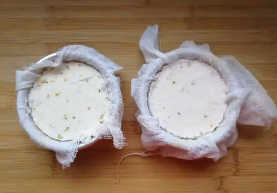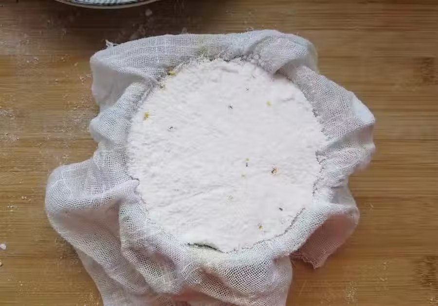 6、模具中墊入紗布,倒入米粉,千萬不要壓,裝滿輕輕用刮板抹平就可以了。我用的是4寸戚風模具,這些量可以做兩個。