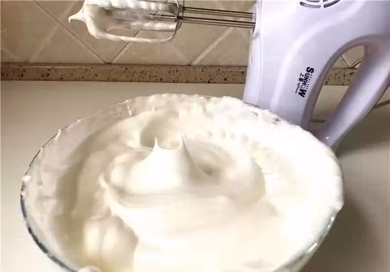 7.蛋清裡放入幾滴白醋,用電動打蛋器攪打至魚眼泡狀態,分三次放入細砂糖攪打。攪打至接近硬性發泡狀態。