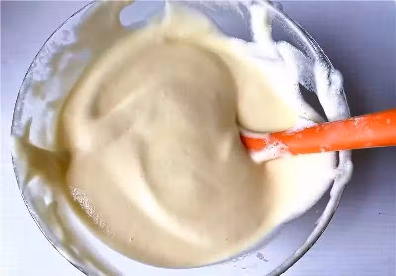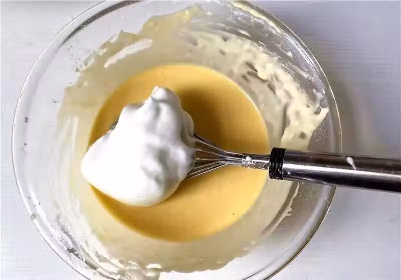 9.再將拌好的麵糊倒入剩下的蛋白霜裡,翻拌均勻。烤箱提前設置120度預熱7分鐘。