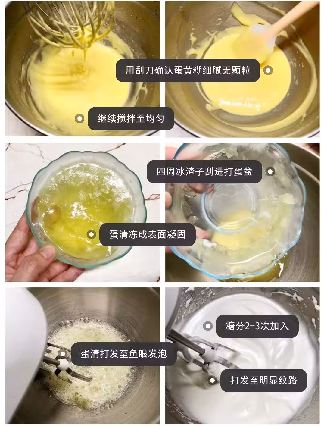 燙麵戚風蛋糕主要影響因素:油溫、蛋白打發、翻拌,大家多多練習,一定可以成功!