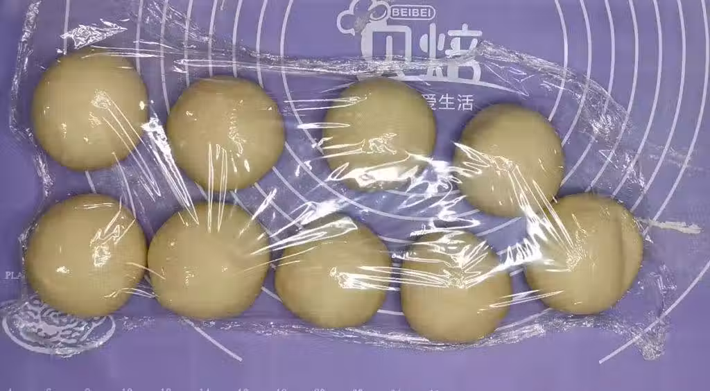 3. 取出麵糰,均勻分割成9份,揉圓,並用保鮮膜蓋好休面十分鐘。
