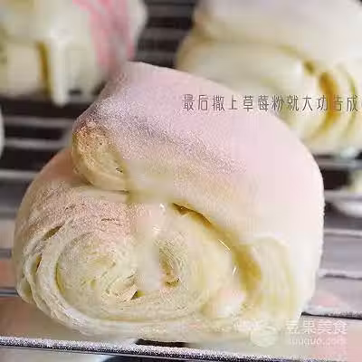 13、等巧克力凝固後再在上面篩入草莓粉即可。