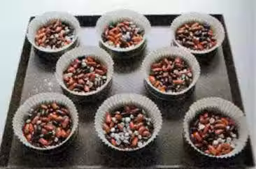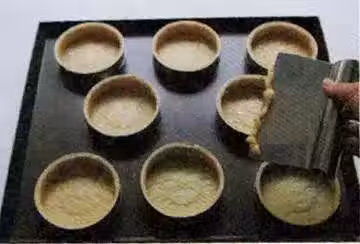 將襯紙放入做法3中鋪好,放上如米粒,豆子,以180℃進行盲烤,烘烤15分鐘後取下米粒或豆子以及襯紙,再烘烤10分鐘或塔皮邊緣上色,靜置冷卻備用。