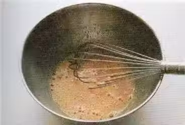 將全蛋放入攪拌盤中打散,加入全部細白砂糖攪拌至蛋液微微變白。