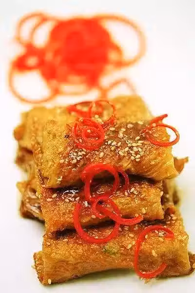 用料:油豆皮一袋,素肉餡少許、醬油、糖、生薑、水澱粉、熟芝麻、紅辣椒一個。